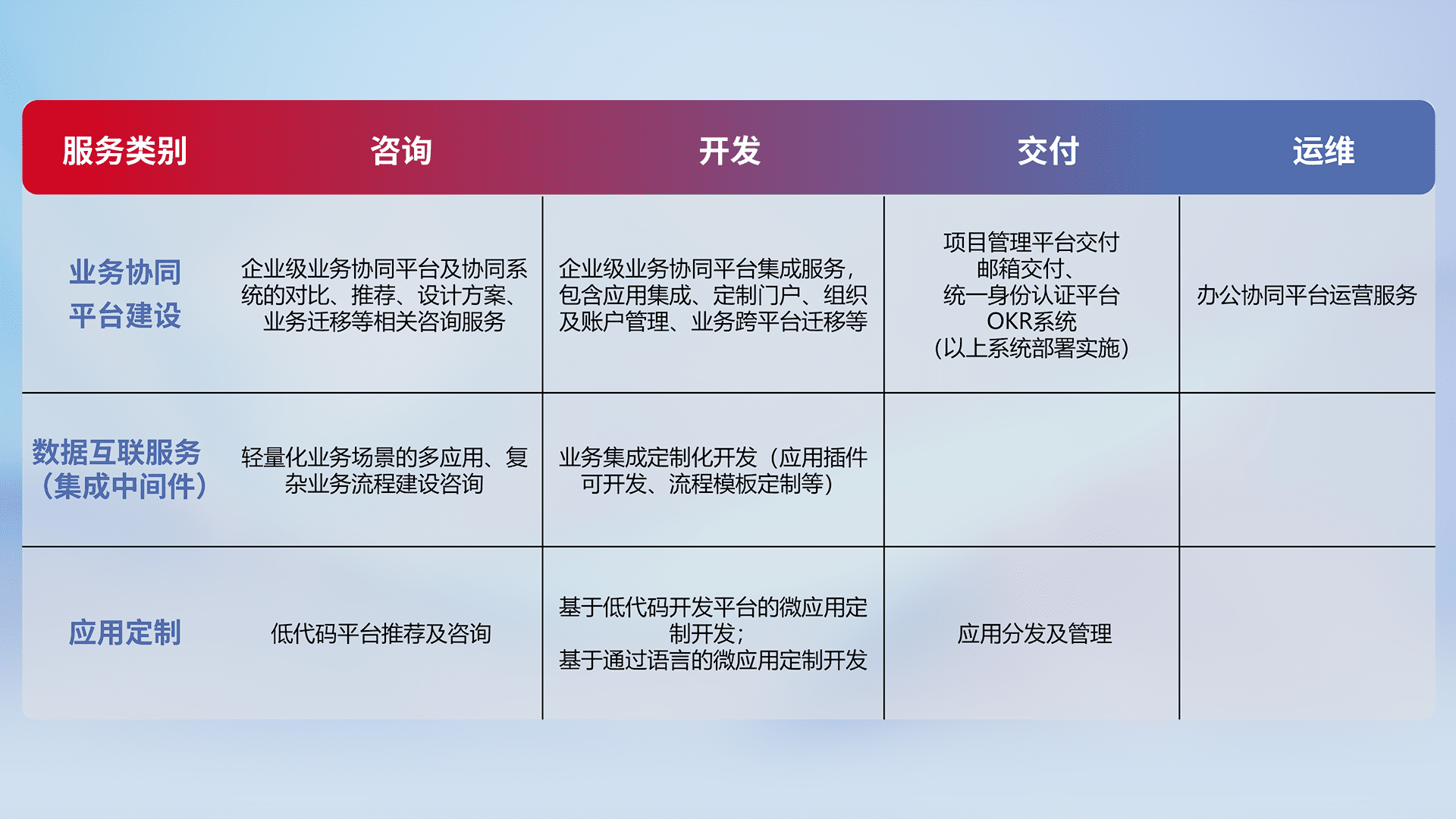 针对钉钉、、企微、、IDaas等平台级产品提供产品的规划、、方案、、交付、、定制化开发等服务,,,实现如统一协同办公、、、、智能客户服务、、、、混合会议管理、、、、智能数据查询、、、、等业务场景,,,实现数字化转型。。