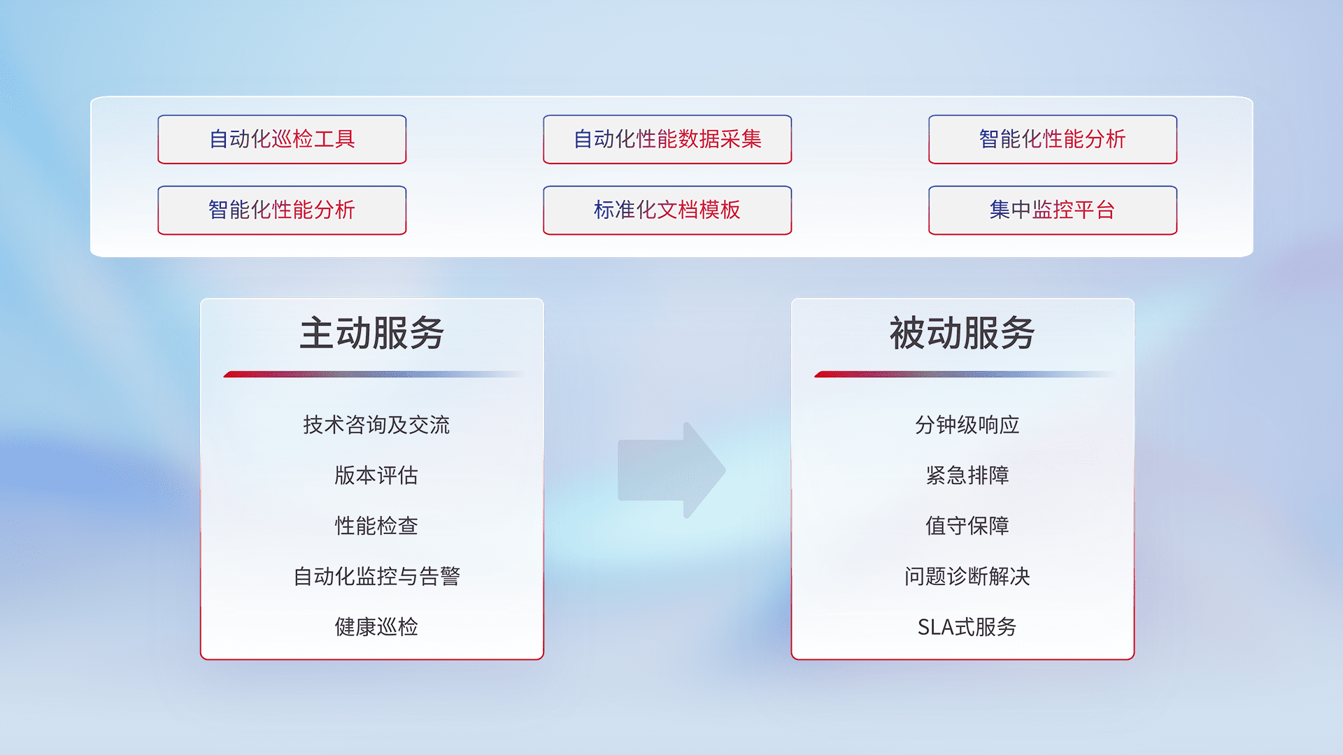 智能化工具和标准化文档,,,,保障服务质量,,提供主动服务(包含技术咨询、、版本评估、、性能检查、、、自动化监控与告警、、健康巡检)和被动服务包含(分钟级响应、、、、紧急排障、、、值守保障、、、问题诊断解决、、SLA服务)。。。