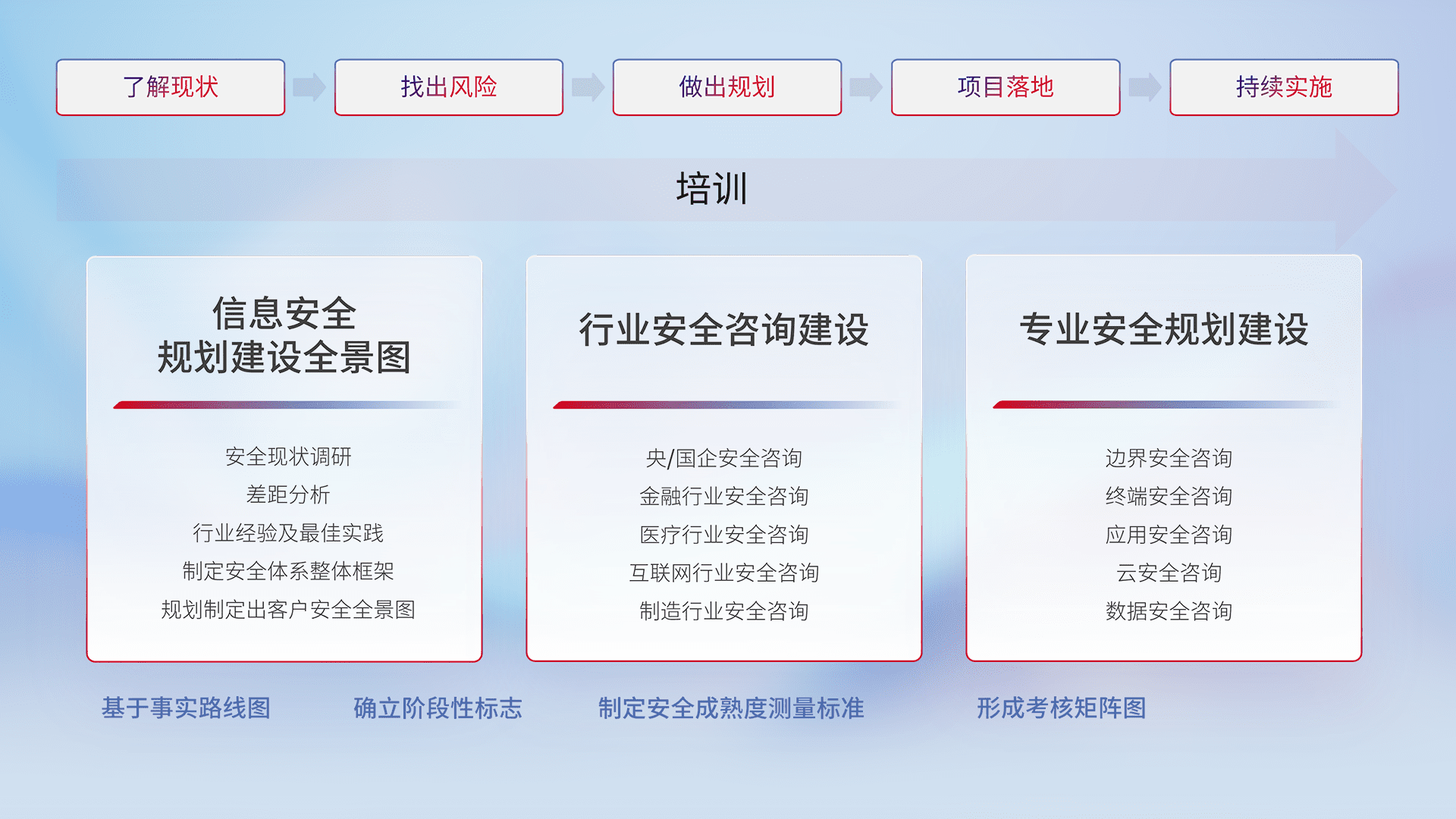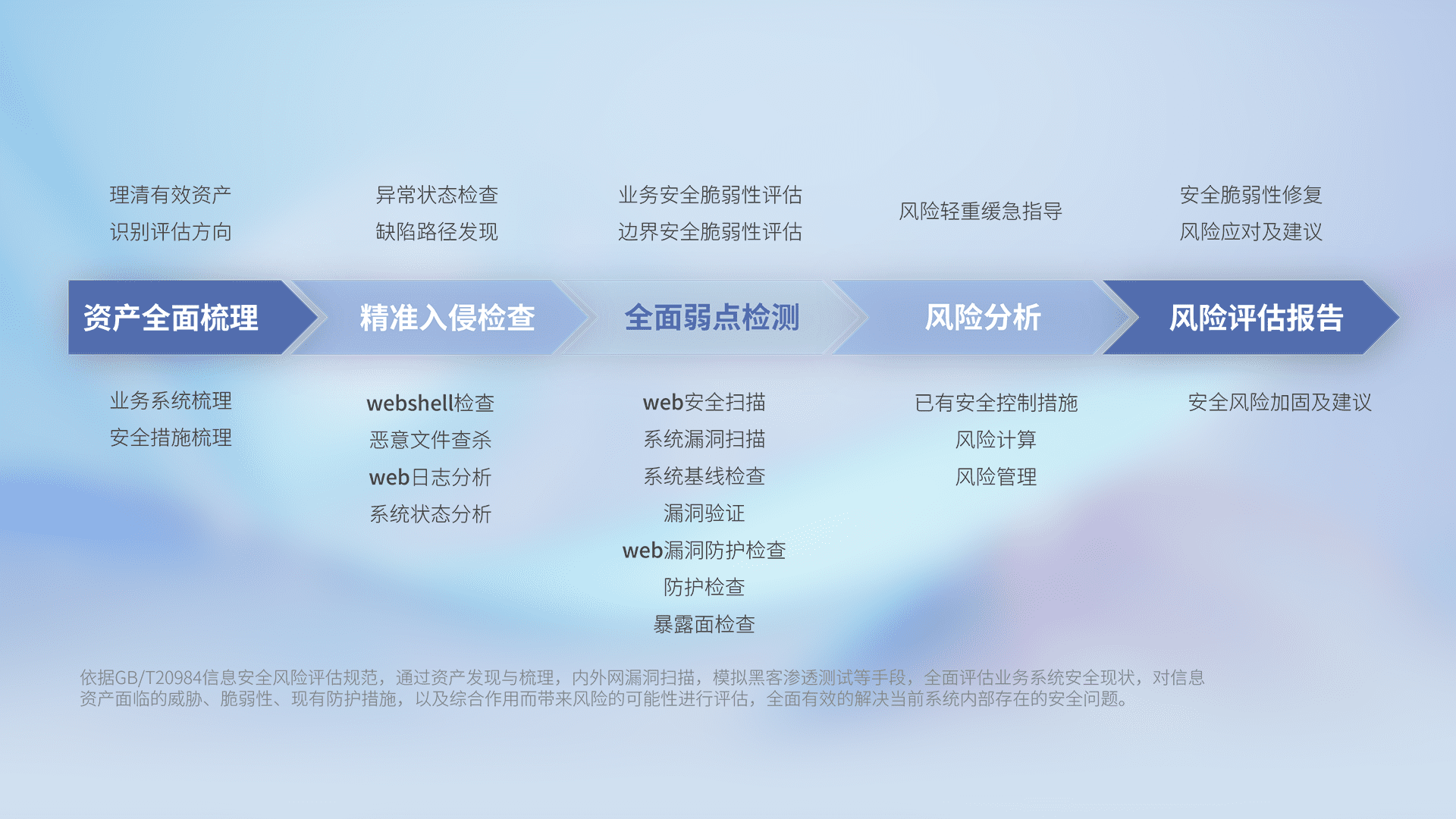 针对客户行业特性,,,以专业的安全服务+多厂商联合解决方案提供专属的一站式安全管理服务,,,帮助客户全面感知网络空间威胁,,,基于识别、、检测、、、、分析、、、防护、、、、监测、、、、响应的服务理论模型,,,从方案咨询、、集成交付、、评估验证、、优化加固、、、运维运营,,,致力于为客户提供完整的闭环管理式安全服务。。。。以实战经验为客户打造高抵御风险的安全体系,,,,帮助客户发现威胁、、、对抗威胁、、、、处置威胁,,不断积累安全对抗能力,,持续保障数字化安全。。。